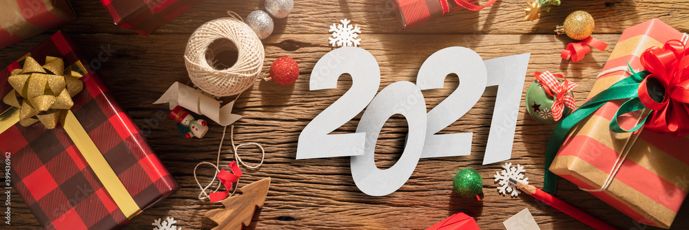 topview flatlay of 2021 card present gift boxes with red color and ribbon wrap on wooden texture floor with decorative ornament new year and chiristmas festive greeting background ideas concept