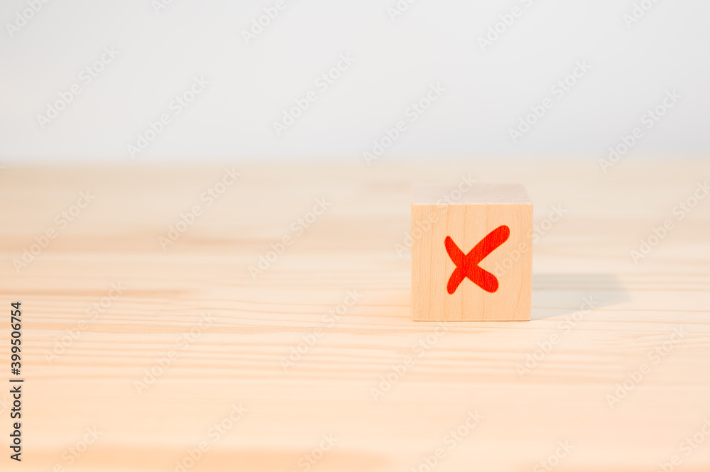 cross mark x on wooden cube. red cross sign on the edge of a wooden cube. Concept of negative decision making or choice of rejection.