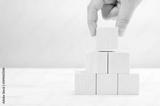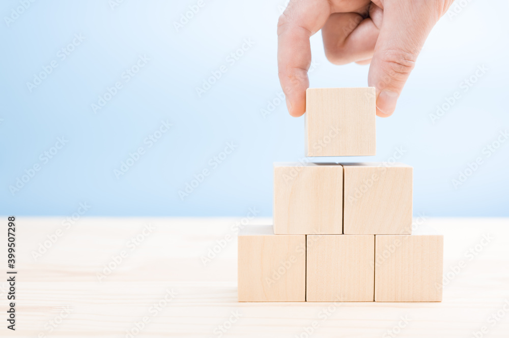hand lays out builds a pyramid of wooden cubes. for create icon symbol to success concept. Business concept for growth success process. Copy space