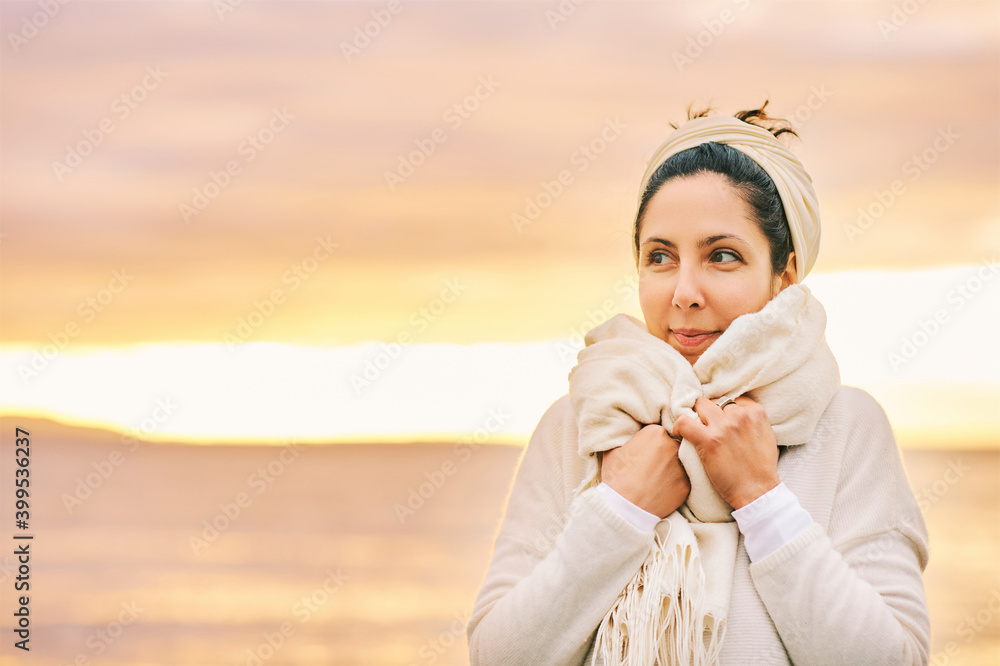 Outdoor portrait of young latin woman posing by lake or sea, warmself with big scarf