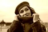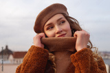 Fashionable happy smiling woman wearing trendy beige beret, turtleneck sweater, brown faux fur coat, posing in European city. Copy, empty space for text