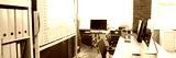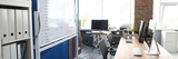 Close-up of company office with modern computers on wooden desk. Expensive devices. Stylish working place for creative people. Blue wall with board. Technology and development concept