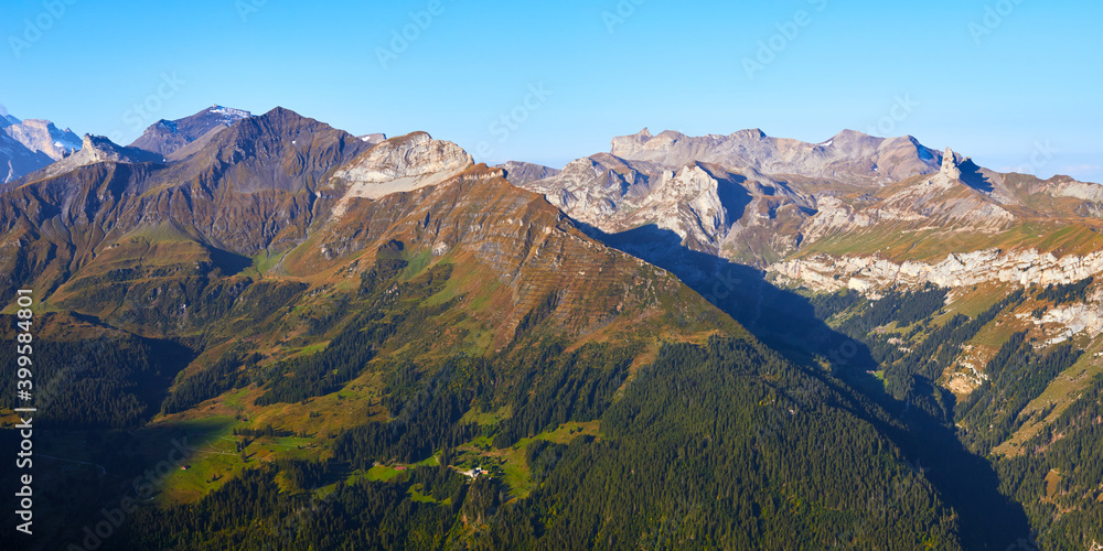 Panoramic view of the mountain range above Lauterbrunnen valley in Switzerland in the autumn morning.