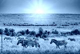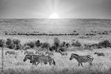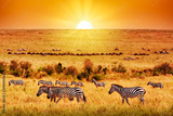 Zebra group with amazing sunset in african savannah. Serengeti National Park, Tanzania. Wild nature african landscape and safari concept