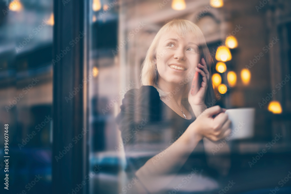 Beautiful young blonde woman sitting in a cafe talking on a mobile phone by the window with a reflection of the city street