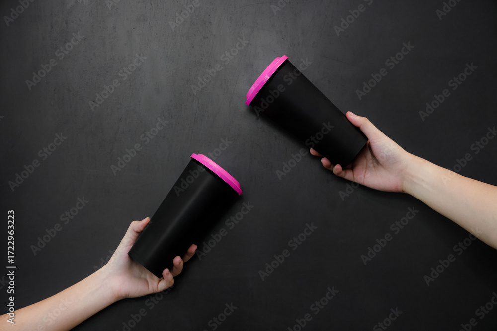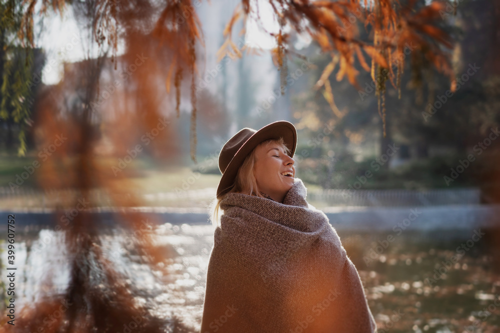 Young beautiful woman in a hat wrapped in a gray plaid by the pond in the park enjoying nature