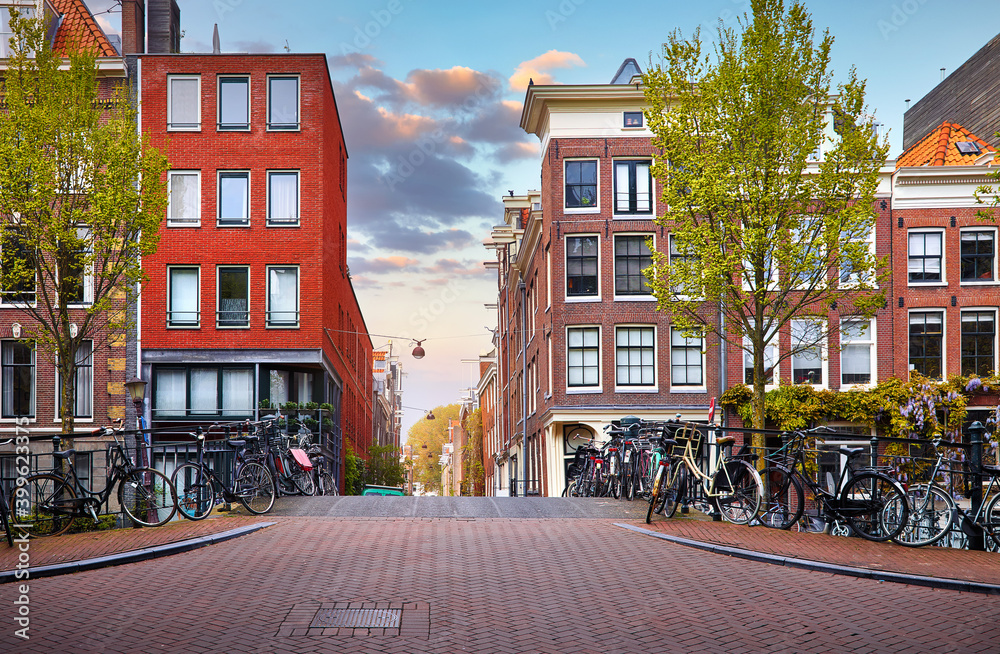 Amsterdam. Autumn streets with traditional houses. Urban landscape with bicycles and yellow tree. Netherlands.