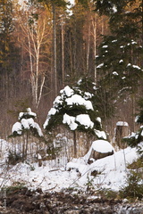 Christmas tree dusted with snow in a winter, mixed wilderness forest
