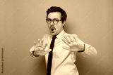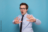 Banker or broker showing palm as stop stay hold gesture isolated on white copyspace background