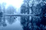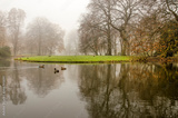 A reflective pond, trees, grass, ducks coots and a heron on a misty day in late autumn in The Park in Rotterdam, The Netherlands