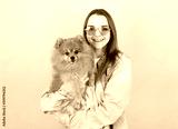 Studio shot of female model holds fluffy pet closely to face, smiles with happiness, posing against pink background.