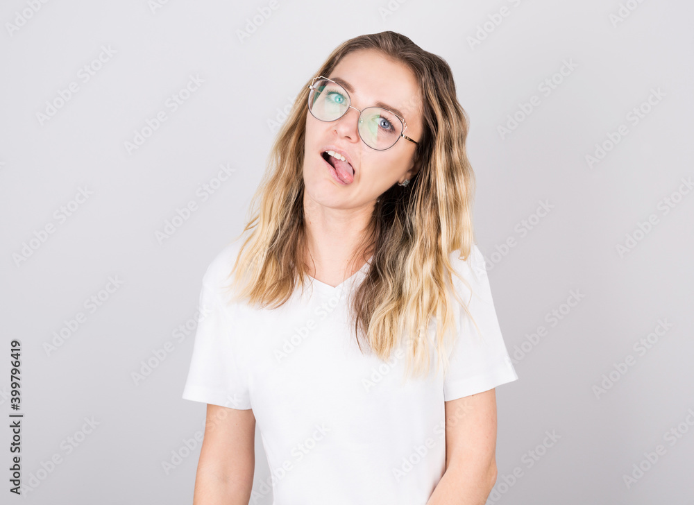 Tired sleepy woman stuck out her tongue from fatigue, has sad expression, difficult at work. Isolated over white background