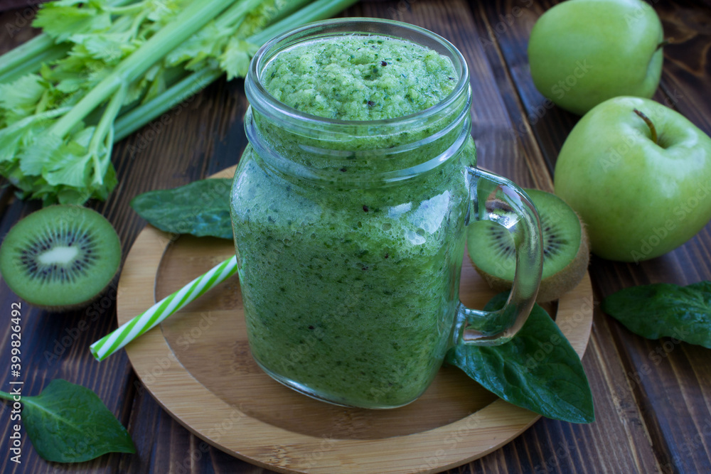 Green smoothies with fruits and vegetables on the wooden cutting board