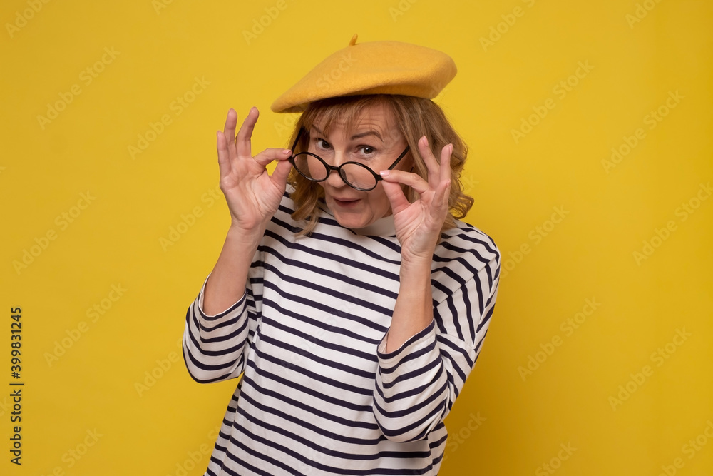 Middle age curious woman in yellow hat and glasses smiling looking at the camera.