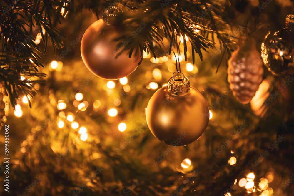 golden bauble on a decorated Christmas tree with festive lights