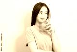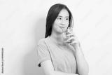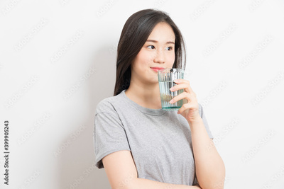 Beautiful portrait young asian woman smiling drinking a glass of water mineral on white background.