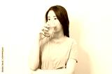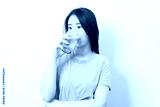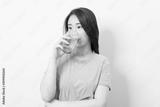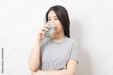 Beautiful portrait young asian woman smiling drinking a glass of water mineral on white background.