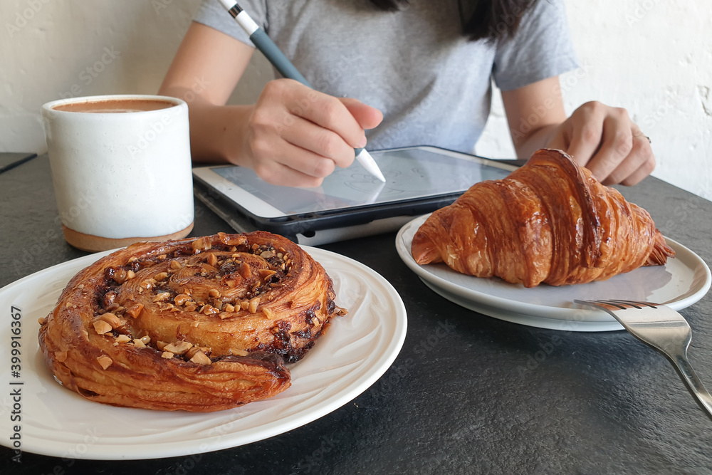 Soft focus close up French pastry dessert croissant and beignet with people using a digital tablet in a cafe as background.