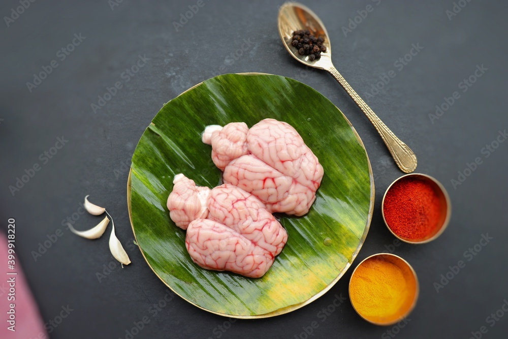 Uncooked Goat brain or Bheja or Mutton Brain.Perfect to cook bheja fry or bheja masala. Indian cooking ingredients. Copy space.