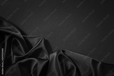 Black silk satin fabric background. Copy space for text or product. Wavy soft folds. Beautiful elegant black background.