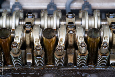 Close up Arm valve rocker of Single Over Head Camshaft engine.Car maintenance Checking and adjusting valves clearance.