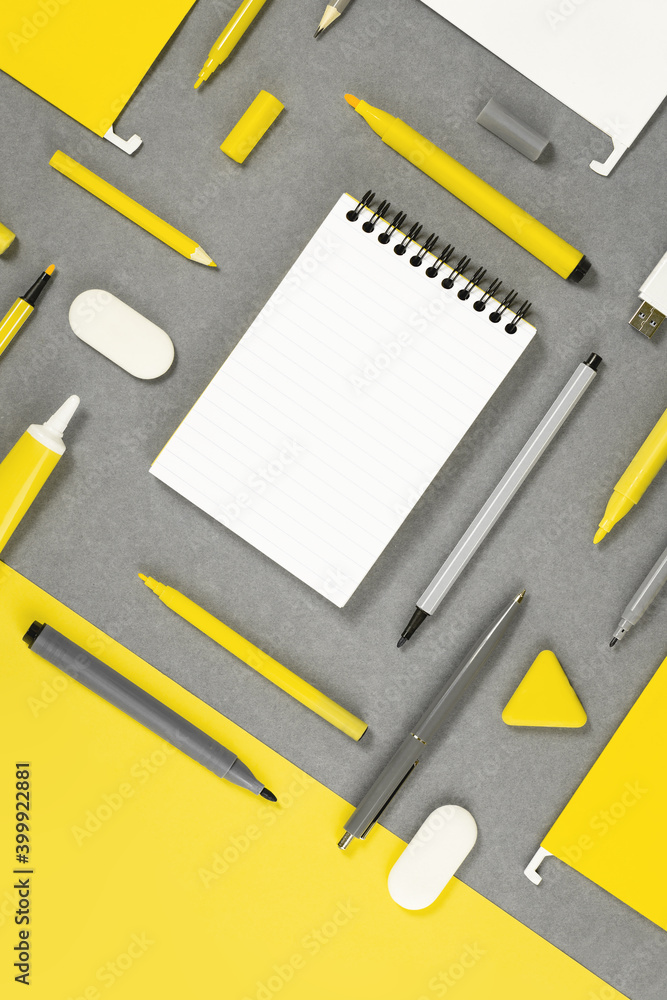 Assorted office and school white yellow and gray stationery . Organized knolling for back to school or education and craft concept. Note pad. Illuminating Banner. Copy space. Mockup banner