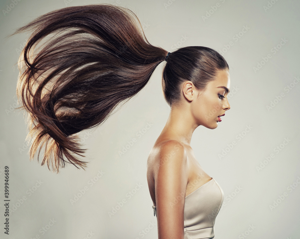 Profile portrait of a beautiful woman with a long straight hair.