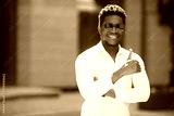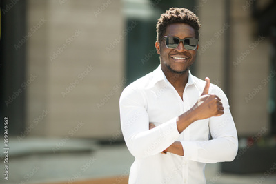 handsome young african man in shirt and sunglasses with hand gesture