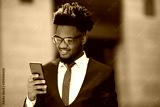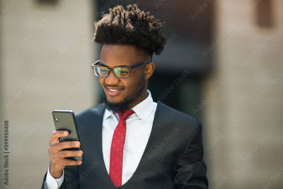 handsome young african man in suit and glasses with phone