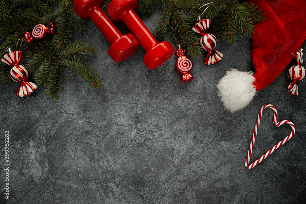 Two red dumbbells, Santa Claus hat, Christmas tree branches, candy canes and decor pendant ornaments. Healthy fitness lifestyle holiday season composition, festive flat lay concept with copyspace.