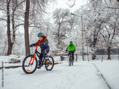 A boy and his father ride bicycles in a winter park. Wonderful winter day outdoors after snowfall. The bearded man is the boy's father, follows him on a bicycle.