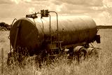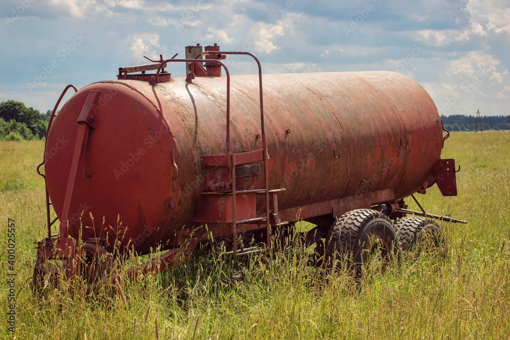 Iron barrel-trailer for transporting something with a mount on the car in the meadow