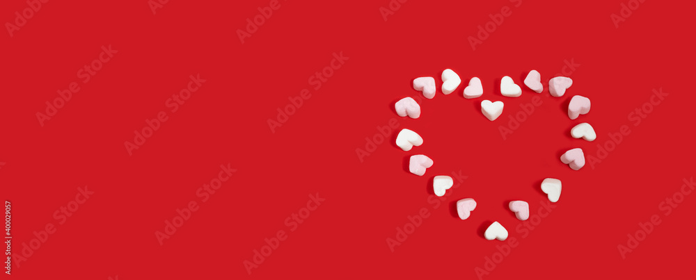 sweets-pink and white marshmallows in the shape of hearts on a red background congratulate you on Valentine's Day. copy space, banner