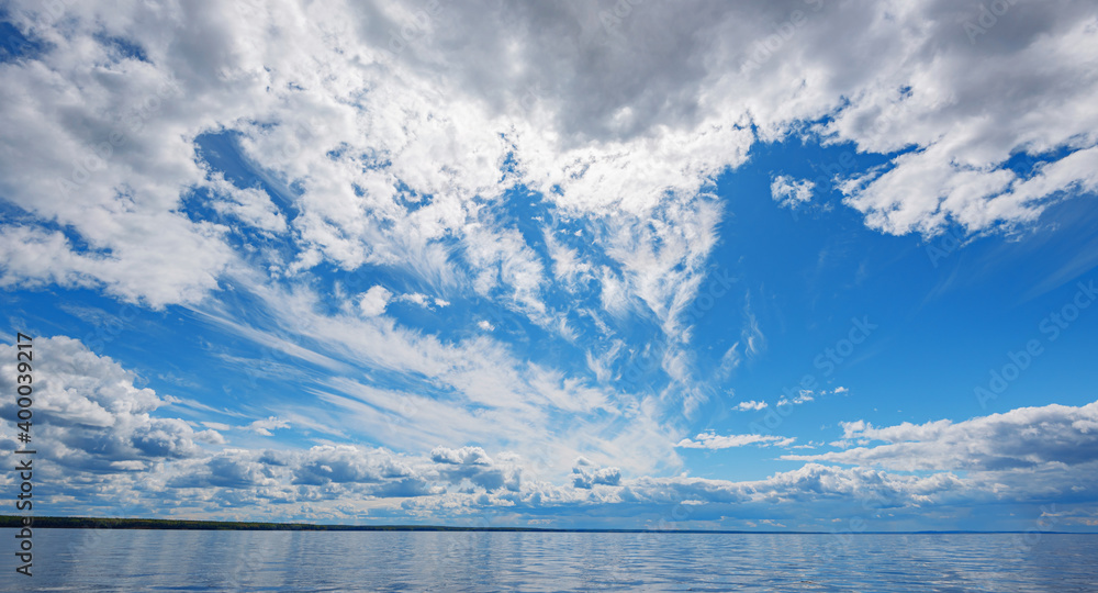Panorama of calm lake, Kama river blue sky with clouds reflected in the water.