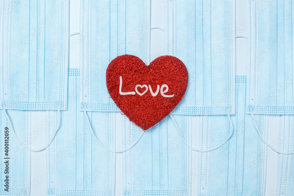 Red heart shape and medical masks on white background. Concept of health lovers and healthcare