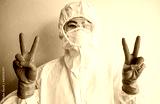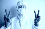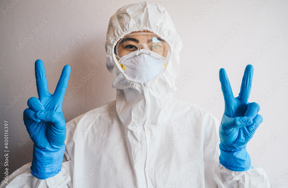 Healthcare worker wearing PPE suit with mask for protect virus and showing victory sign.