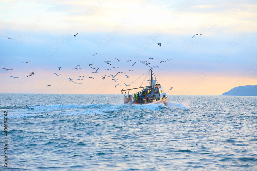 Fishing boat surrounded by black-headed gulls in coming back to the port at the sunset