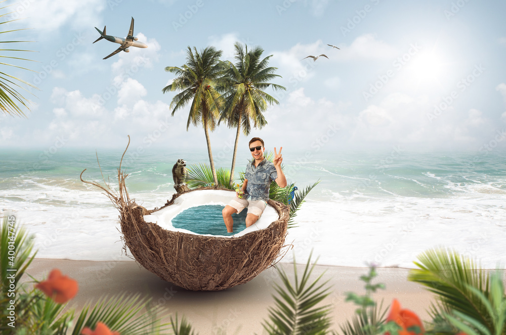 Funny summer vacation collage with a man sitting in a coconut