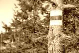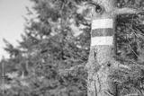 Hiking green trail sign on a tree, selective focus, Karkonosze National Park, Poland.