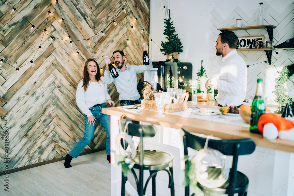 Cheerful group of friends in kitchen having fun and celebrating Christmas holiday at home