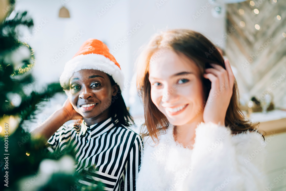 Happy diverse women near decorated Christmas tree
