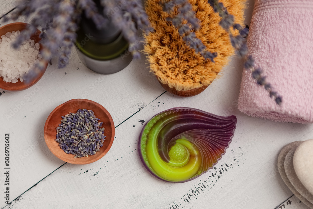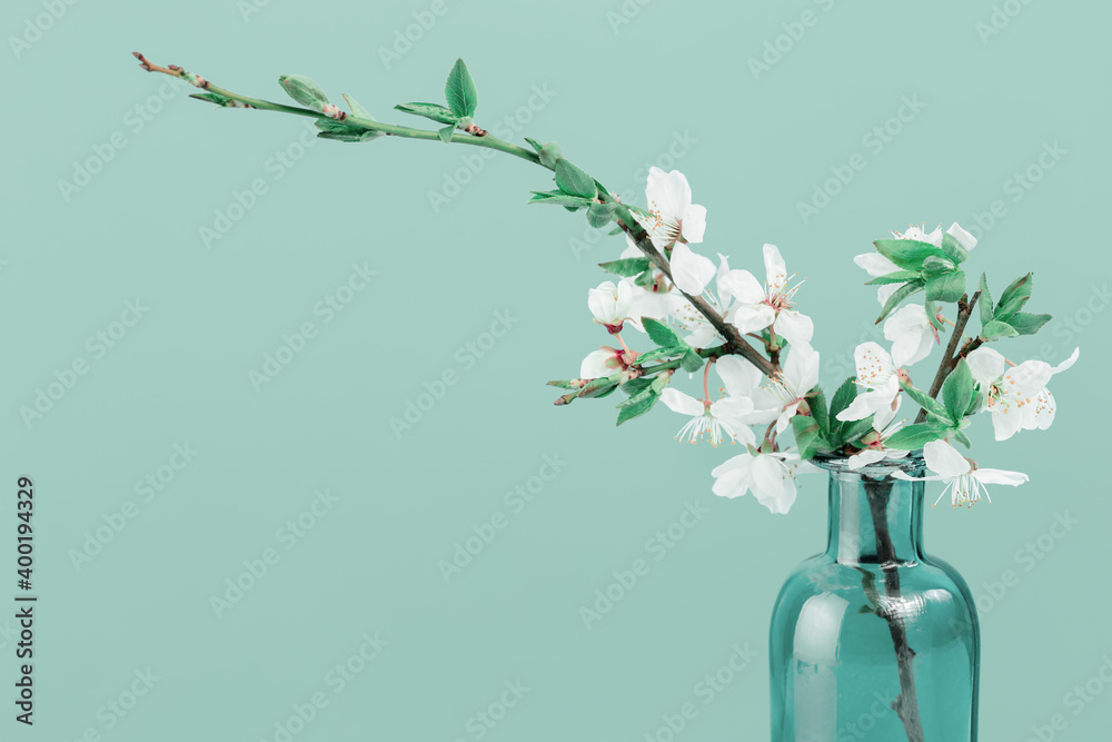 Spring or summer festive blooming with white flowers fruit tree branches in small green glass vase against tender green background. Fresh floral background with copy space