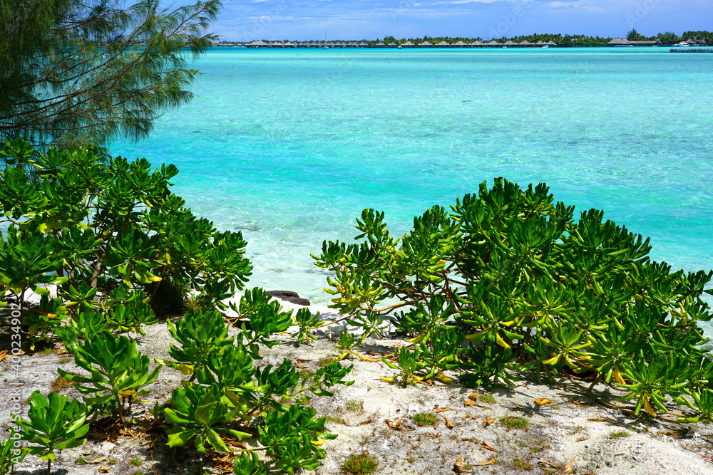 View of a tropical landscape with palm trees, white sand and the turquoise lagoon water in Bora Bora, French Polynesia, South Pacific
