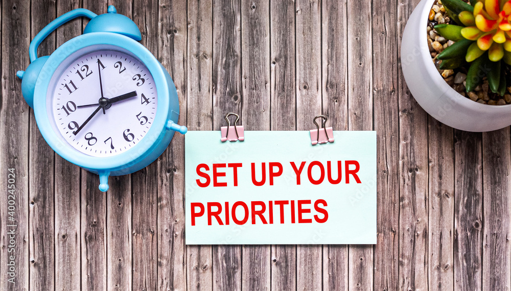 On a wooden table, an alarm clock and a cactus flower. On the sticker text Set up your priorities