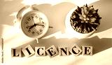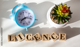 LICENSE word made from building blocks on white background, near cactus and alarm clock