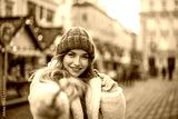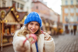 Christmas, New Year, winter holidays conception: happy smiling lady posing at street festive fair, holding candy canes. Copy, empty space for text