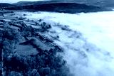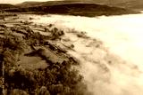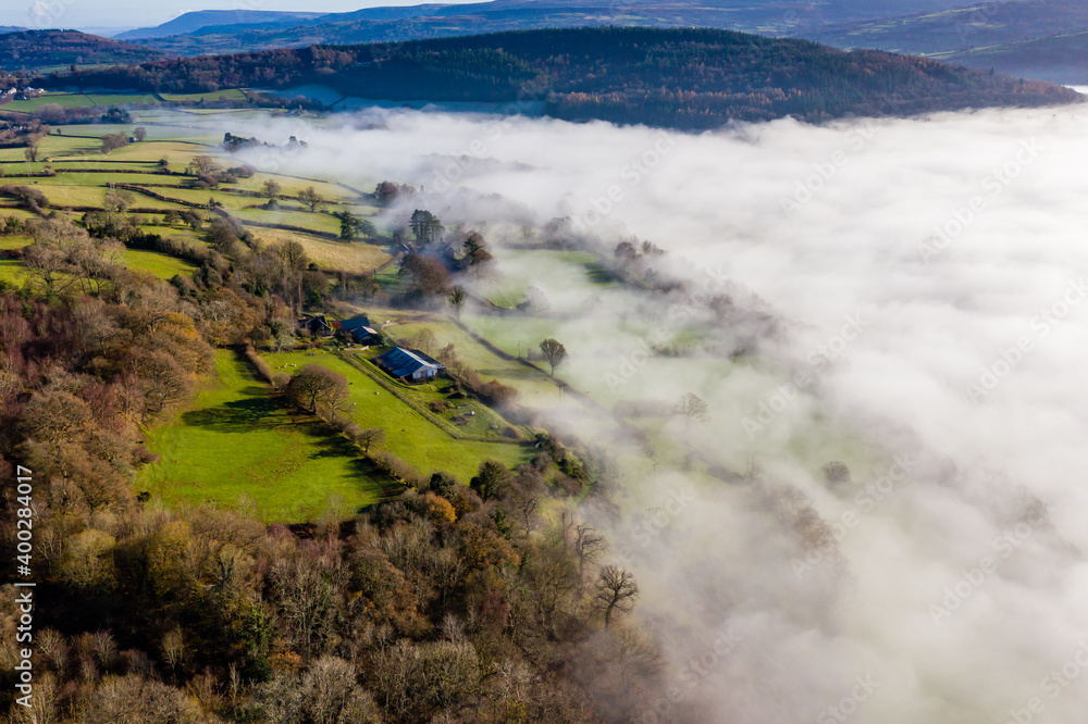 Aerial view looking down onto rural farmland and a valley filled with a blanket of fog (Wales)