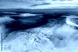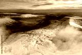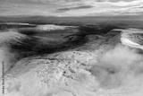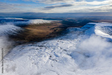Aerial drone view of snow covered mountains and ridges rising above a brown valley (Neuadd, Wales)