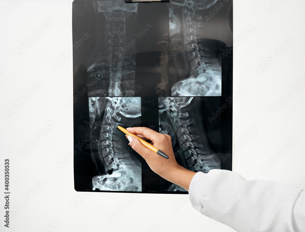 Doctor neurologist looks to x-ray image of the patient cervical spine using negatoscope. Treatment of spine disease, and osteochondrosis