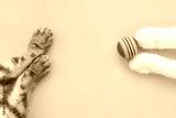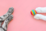 White and gray cat paws and ball. Pink background, copy space, top view. Concept of games and entertainment for pets..